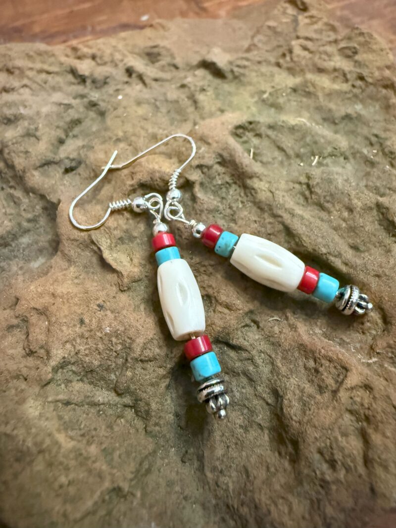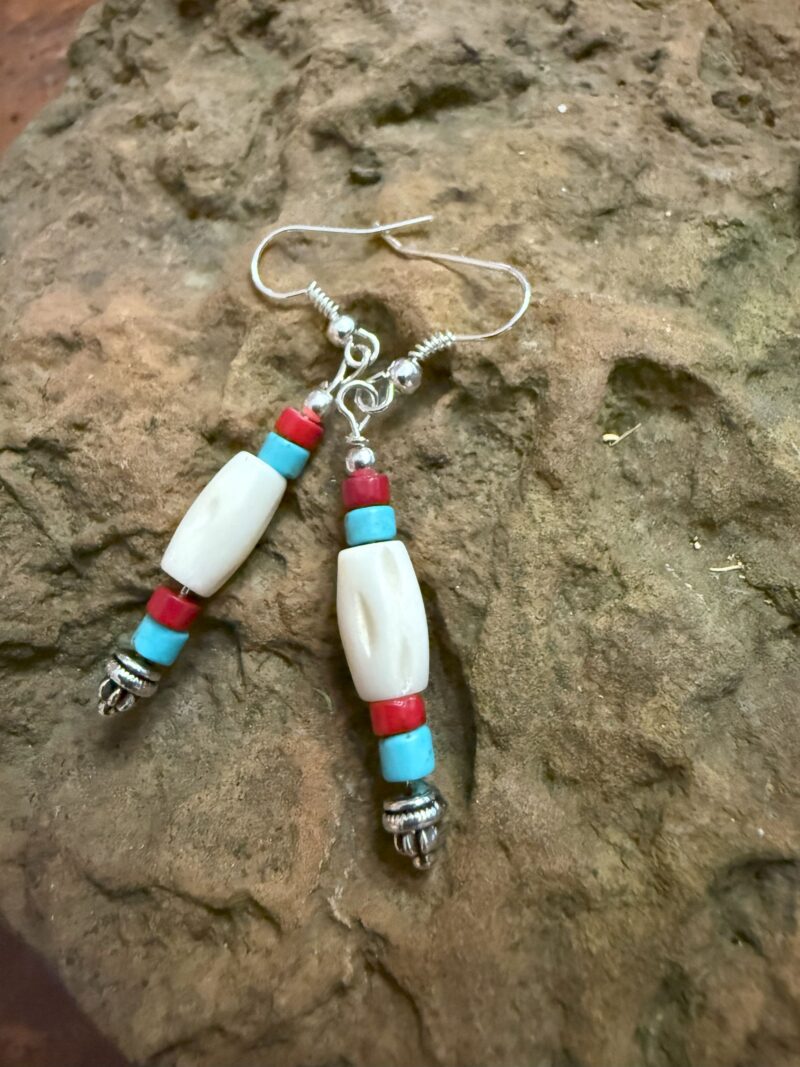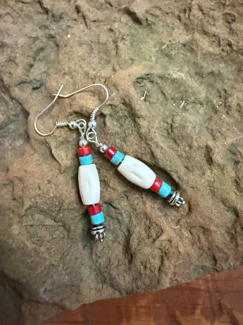 Coral, Bone, Turquoise, Silver 2 Inch Earring