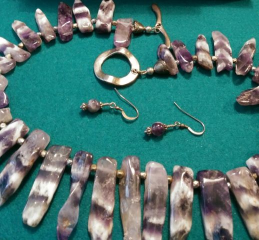 Beautiful shards of Zebra Amethyst encircle the neck to bring out the “wild side.”